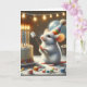 Cute mouse holding a marshmallow on a stick ready to roast over candles on a birthday cake.