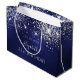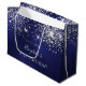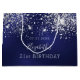 A gift bag for a girly and glamourous 21st (or any age) birthday. A deep blue background decorated with glitter dust. The blue colour is uneven. Personalize and add a date, name and age 21. The text: The name is written in white with a modern hand lettered style script