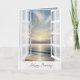 View of an ocean scene with sunrise, clouds, and beach sand through an open white window with sheer curtains.