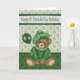 Wish anyone in general a Happy St. Patrick's Day Birthday with a card featuring a cute bear wearing a sweater and hat holding a balloon on a green with shamrocks background. Design by Laurie Schneider/Elements by Digital Designs by Elena/Diana'z Designz