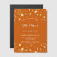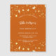 A burnt orange background decorated with golden stars. Personalize and add a name and party details. The name is written with a hand lettered style script, white coloured letters.