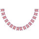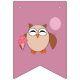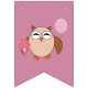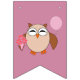 This awesome festive bunting features a cute brown owl with big sleepy eyes. The owl is holding a pretty pale pink balloon and a bouquet of bright pink flowers wrapped in a pale pink cone.