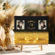 Elegant, classic, glamourous and feminine. A faux gold coloured ribbon with a bow with golden glitter and sparkle, a bit of bling and luxury. A guestbook for a 70th birthday party. Black background. With the text on the front cover: 70 years (or any age) and a name. Templates for two of your own photos.