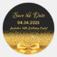 Elegant, classic, glamourous and feminine style party save the date sticker. A faux gold coloured ribbon and bow with faux golden glitter and sparkle, a bit of bling and luxury for a birthday. Black background. With the text: Save the Date written with a modern hand lettered style script. Templates for the date and name/text.