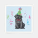 Happy birthday greetings with this cute design featuring a smiling, party hat-wearing Black Labrador Retriever puppy surrounded by colourful streamers.