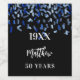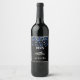 A wine label for a 50th (or any age) birthday party. A black background with blue confetti. Personalize and add birth year, name and age. The name is written with an elegant hand lettered style script.
