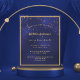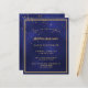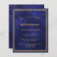 A trendy, modern 50th (or any age) birthday party invitation card for men, guys, male. A dark blue, navy blue background. The blue color is uneven. With a faux gold frame and golden confetti, golden colored letters. Personalize and add your party information.