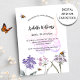 A white background on the front. Decorated with bees and painted wildflowers in violet and pink and a large butterfly. Personalize and add a name and party details.