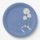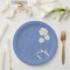 White daisy bouquet tied with ribbon on blue background with pin dot pattern for birthday party.