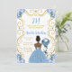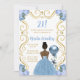 This birthday party invitation features an elegant gold frame, a beautiful princess with dark skin and a dusty blue dress, flowers and a balloon. This is perfect for a birthday party.