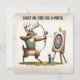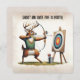 Cartoon buck deer wearing a vest shooting an arrow at a target on an easel for a birthday party.