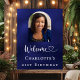 A welcome poster for a 21st (or any age) birthday party. Personalize and add a photo, a name and age. A navy blue, uneven coloured background, and an arch shaped photo frame.