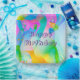 Birthday balloons and party hat with Happy Birthday text on pink, aqua, blue, green, orange, purple, and yellow fluid abstract design.