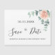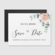 A modern Save the Date magnet card for a 50th (or any age) birthday party. On the front: A chic white background decorated eith green watercolored eucalyptus greenery and a rose gold coloured rose, flower floral. Personalize and add a date and name/age 50. Black coloured letters. The text: Save the Date is written with a large trendy hand lettered style script.