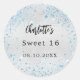 A faux silver looking background. Decorated with blue faux glitter, sparkles. Personalize and add a name and date. The name is written with a hand lettered style script