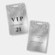 A modern, stylish and glamourous badge for a 21st (or any age) birthday party. A faux silver metal, metallic looking background with faux glitter drip, paint dripping look. Personalize and add a name and age on the front. The name is written with a modern hand lettered style script with swashes. With the text: VIP and Number 21 . To keep the swashes only delete the sample name, leave the spaces or emoji's in front and after the name.