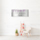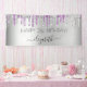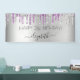 A banner for a girly and glamorous 21st (or any age) birthday party. A faux silver metallic looking background with elegant purple and faux silver glitter drips, paint dripping look. The text: Personalize and add a name written in dark rose gold with a large modern hand lettered style script. Perfect both as a welcome banner or as party decor.