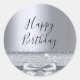 Modern, stylish and glamourous for a girl's, woman's birthday party.. A faux silver metallic looking background with an elegant faux silver bow, ribbon and sparkle. The text: Happy Birthday is written with a modern black hand lettered style script.