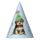 Happy birthday greetings with this cute design featuring a happy, party hat-wearing Yorkshire Terrier puppy surrounded by colorful streamers.