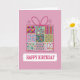This is a birthday card with a birthday present created with a nine patchwork block appliqué using a zig zag stitch. The background is polka dots and the text says, ‘Happy Birthday.’