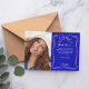 A birthday Thank You photo card. A royal blue background. Decorated with a white hand-drawn bow and frame. Personalize and add your photo and thank you note. Thank you with a heart.