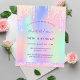 A girly and feminine 18th (or any age) birthday party invitation. On front: A rainbow, holographic coloured background in purple, pink, mint green, rose gold. Decorated with blush pink faux glitter drips, paint dripping look. Personalize and add a name and party details. The name is written with a hand lettered style script, purple coloured letters.