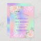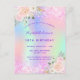 A girly and feminine 18th (or any age) birthday party invitation. On front: A rainbow, holographic coloured background in purple, pink, mint green, rose gold. Decorated with blush pink faux glitter, sparkles. Personalize and add a name and party details. The name is written with a hand lettered style script, purple coloured letters.