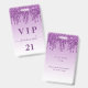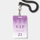 A modern, stylish and glamourous badge for a 21st (or any age) birthday party. A purple gradient background, purple faux glitter drip, paint dripping look. Personalize and add a name and age 21. The name is written with a modern hand lettered style script with swashes. The text: VIP og Number 21 is written in purple. To keep the swashes only delete the sample name, leave the spaces or emoji's in front and after the name.