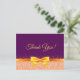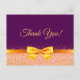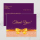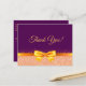 An elegant purple background and a faux gold bow and ribbon with rose gold coloured sparkle. On front a hand lettered style script and the text: Thank You!