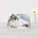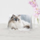 A fluffy Ragdoll cat with striking blue eyes reclines on a soft white rug.