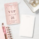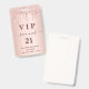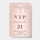 A modern, stylish and glamourous badge for a 21st (or any age) birthday party. A faux rose gold metallic looking background with an elegant faux rose gold glitter drip, paint dripping look. With the text: VIP. Personalize and add name, age, address/date. The name is written with a modern dark rose gold coloured hand lettered style script with swashes.