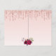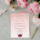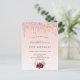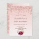 A girly and feminine 21st (or any age) birthday party invitation. On front: A rose gold and blush pink gradient background. Decorated with rose gold faux glitter drips and burgundy and rose gold coloured flowers. Personalize and add a name and party details. The name is written with a hand lettered style script, dark rose gold coloured letters.