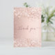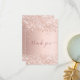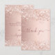 A thank you card for a 50th (or any age) birthday. A rose gold, pink faux metallic looking background colour. With faux glitter dust. On front large dark rose gold coloured hand lettered script and the text: Thank You.