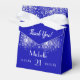 An elegant and glamourous blue and white 21st (or any age) birthday favour box. Royal blue coloured background with faux silver glitter dust. With the text: Thank You! Templates for a name, date of birth and date of anniversary and age number. White letters.