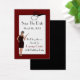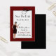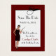 Pretty Art Deco style Save the Date birthday announcements, done in red, black, and white. Lovely digital artwork of a roaring 20's flapper decorates the bottom left of the card, with a dark red frame around the white text area and a black decorative scroll flourish at the top. Text in black and red is fully customizable to suit your needs.