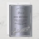 A trendy, modern 50th birthday party invitation card. A faux silver metallic looking background, with a frame and music notes, black coloured letters. Personalize and add a name and party information.