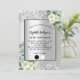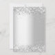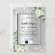 Faux silver looking background decorated with white florals, flowers, eucalyptus greenery and faux silver glitter, sparkles. Personalize and add your name and party details. Black letters.