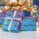 Iridescent soap bubble pattern on rainbow background with happy birthday text.