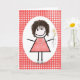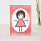 Cute stick figure girl with kinky hair, sneakers, gingham dress, pearl necklace, and daisy bouquet on red and white gingham background.