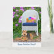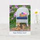 Welsh Terrier with a basket of colourful yarn on a white wicker chair in rhododendron garden. Name on card can be customized.