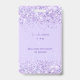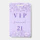 A modern, stylish and glamourous badge for a 21st (or any age) birthday party. A violet background with violet, lavender coloured confetti. With the text: VIP. Personalize and add name, age, address/date. The name is written with a modern hand lettered style script with swashes.