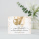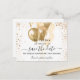 A chic white background decorated with faux gold glitter and balloons. Personalize and add a date and name/age. The text: Save the Date is written with a large trendy hand lettered style script.