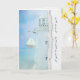 white lighthouse and sailboat on ocean water in watercolor painting with torn edge border for general birthday