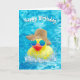 Yellow rubber duck with gradient blue sunglasses and sun hat in water splash on a swimming pool background for birthday.