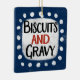 A fun and cute typographic southern food design that says "Biscuits And Gravy". It has black and red text on a white rectangle with funky, playful white dots surrounding it, all on a blue background.