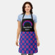 Women's apron with an image of a bisexuality pride flag and a rainbow, and repeating seamless flower pattern; pink, purple, and blue design on a black background, a blue variant, with a customizable text template for your own name or message