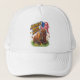 American Buffalo Bison in the orange and black text. An American bison buffalo grazing on grass with the American flag displayed in the background.