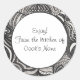 Black and white abstract line drawing in the shape of a circle frame with a placeholder to add a custom message or cook's name, printed on round stickers.