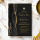 The left-hand edge of this elegant modern Confirmation invitation features a black watercolor agate border trimmed with faux gold glitter. A gold foil cross appears above the customizable text, which combines real gold foil handwriting, copperplate and italic fonts on a slate black background. The reverse side features a matching black and gold agate design.