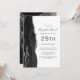 The left-hand edge of this elegant modern wedding anniversary party invitation features a black watercolor agate border trimmed with silver faux glitter. The customizable text combines charcoal gray handwriting, copperplate and italic fonts on a white background. The reverse side features a matching black and silver agate design.